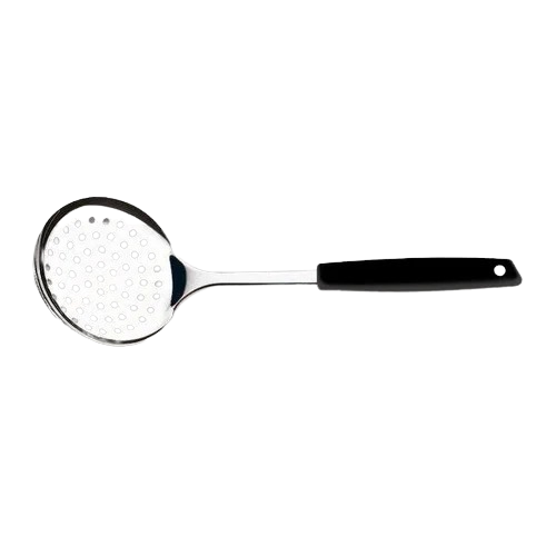Espumadera 100% inoxidable con mango negro.